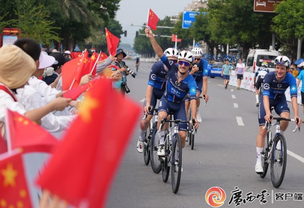 骑行队伍如洪流般涌入金城江赛段,呼啸的破风声、观众的欢呼声和手中不停挥舞的彩旗热烈交织。
