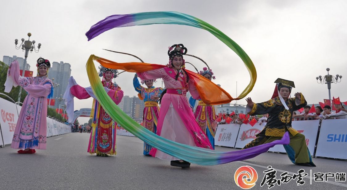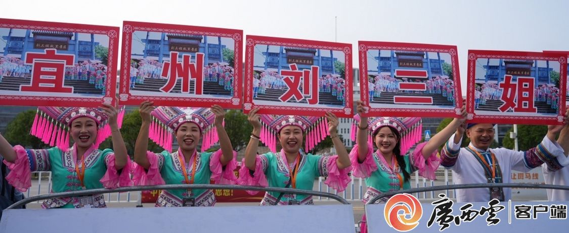 上午9点,宜州刘三姐文化广场早已热闹非凡。赛道两侧,身着蓝靛染等多彩壮锦服饰的群众手持国旗、绣球、彩带形成“人墙”,唱起山歌夹道欢迎各国选手。